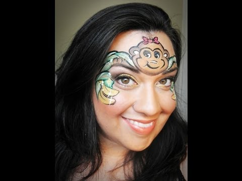 Kiki demonstrates how to paint a Monkey Face. Step 1: Load chisel brush with light brown face paint and paint an outline of the center of the monkey's face around and through the middle of the face. ... View Video